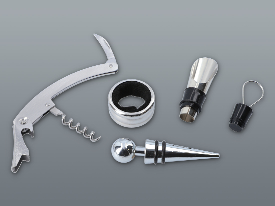 Weinset 4 Stück in Holzkiste, Weinzubehör: Kellnermesser, Ring, Korken und Korken.